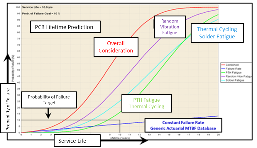 Ansys Sherlock can calculate the probability of failure and lifetime generated by each analysis, including random vibration, solder fatigue, PTH fatigue, mechanical shock, etc. It can compile the different results and obtain the overall probability of failure.